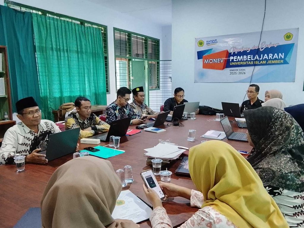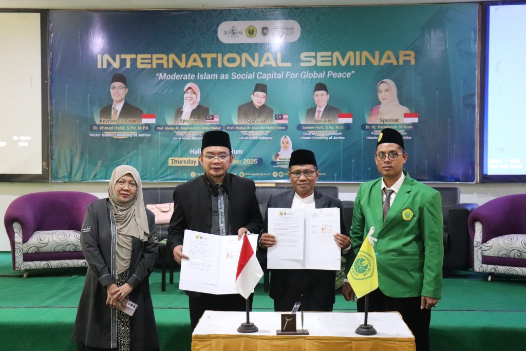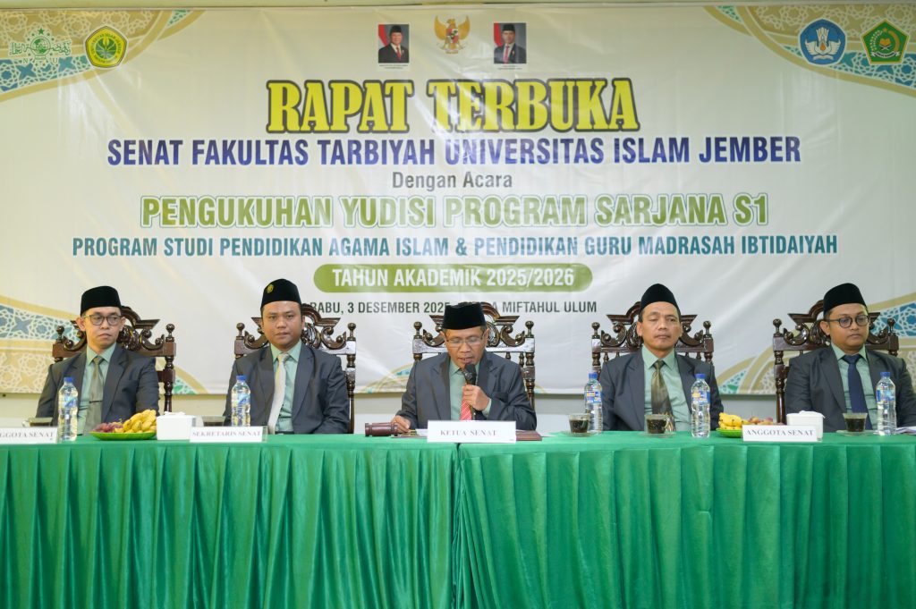 Foto prosesi serah terima jabatan kepengurusan BEM Fakultas Tarbiyah, HMP PAI, dan HMP PGMI periode 2025/2026 yang ditandai dengan penyerahan dokumen secara simbolis dari ketua sebelumnya kepada ketua terpilih, disaksikan oleh Dekan Fakultas Tarbiyah Saman Hudi, S.Ag., M.Si, serta jajaran pimpinan dan pengurus organisasi. Jember – Fakultas Tarbiyah Universitas Islam Jember menggelar Pelantikan Raya Badan Eksekutif Mahasiswa (BEM) Fakultas Tarbiyah, Himpunan Mahasiswa Program Studi Pendidikan Agama Islam (HMP PAI), dan Himpunan Mahasiswa Program Studi Pendidikan Guru Madrasah Ibtidaiyah (HMP PGMI) periode 2025/2026 pada Senin, 23 Februari 2026, pukul 10.00 WIB. Kegiatan tersebut berlangsung khidmat dan menjadi momentum penting dalam proses regenerasi kepemimpinan organisasi kemahasiswaan di lingkungan fakultas. Acara pelantikan dihadiri oleh pimpinan fakultas, dosen, serta perwakilan mahasiswa. Prosesi diawali dengan pembacaan surat keputusan, dilanjutkan dengan pengambilan sumpah jabatan para pengurus yang dilantik. Dalam rangkaian kegiatan tersebut juga dilaksanakan serah terima jabatan dari ketua periode sebelumnya kepada ketua yang baru sebagai simbol estafet kepemimpinan dan keberlanjutan program organisasi. Dekan Fakultas Tarbiyah, Saman Hudi, S.Ag., M.Si, dalam sambutannya menyampaikan bahwa organisasi kemahasiswaan memiliki peran strategis dalam membentuk karakter kepemimpinan, meningkatkan kapasitas manajerial, serta menumbuhkan semangat kolaborasi di kalangan mahasiswa. Ia berharap kepengurusan periode 2025/2026 mampu menghadirkan program kerja yang inovatif, adaptif, dan memberikan kontribusi nyata bagi pengembangan akademik maupun nonakademik di Fakultas Tarbiyah. Adapun pimpinan organisasi yang resmi dilantik yaitu Ketua BEM Fakultas Tarbiyah Elma Aenun Nazila, Ketua HMP PAI Siti Aisyah, serta Ketua HMP PGMI Danil Abdillah. Dalam pernyataannya, para ketua yang baru dilantik menyampaikan komitmen untuk menjalankan amanah dengan penuh tanggung jawab serta memperkuat sinergi antarorganisasi di lingkungan fakultas. Melalui pelantikan raya ini, Fakultas Tarbiyah menegaskan komitmennya dalam mendukung pengembangan organisasi kemahasiswaan sebagai ruang pembelajaran kepemimpinan dan pengabdian. Diharapkan kepengurusan BEM dan HMP periode 2025/2026 mampu menjadi motor penggerak kegiatan mahasiswa yang progresif, profesional, dan berintegritas.